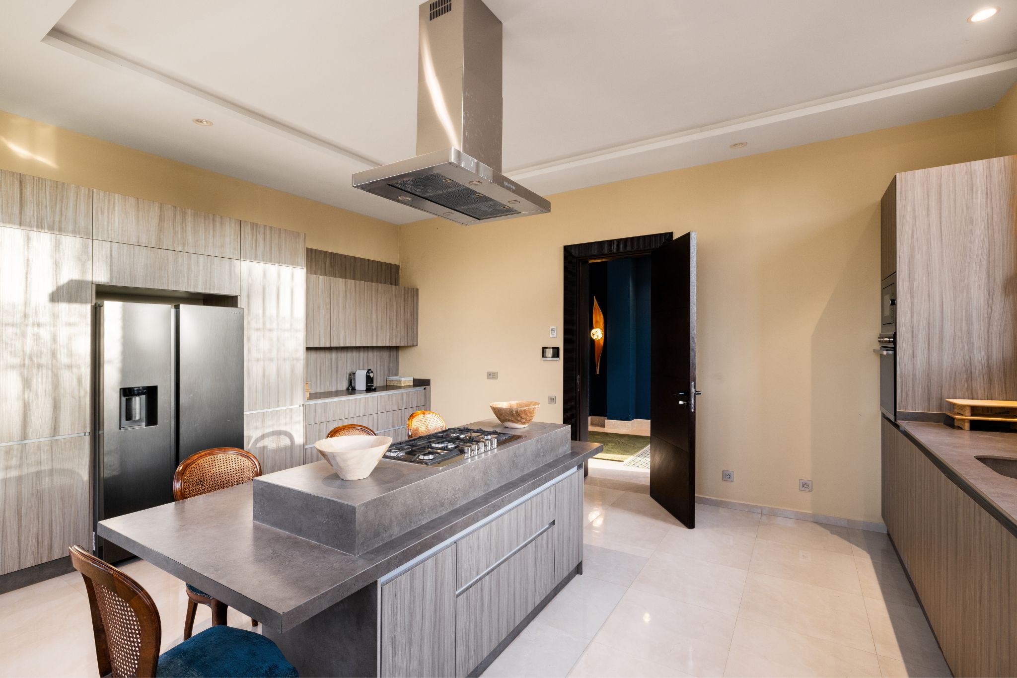 La grande villa du Domaine Bereby est une demeure d’exception de 5 suites avec salles de bain privatives, pensée pour accueillir jusqu’à 10 personnes dans un confort absolu. Idéale pour les familles ou groupes d’amis en quête d’un séjour haut de gamme, elle offre un cadre spacieux et raffiné, sublimé par une décoration mêlant zellige marocain, boiseries sculptées et objets artisanaux africains. À l’extérieur, une piscine permet de se détendre, tandis qu’un hammam traditionnel et un sauna privé complètent l’expérience bien-être. Chaque espace a été soigneusement conçu pour offrir luxe, intimité et sérénité dans un environnement authentique et chaleureux.